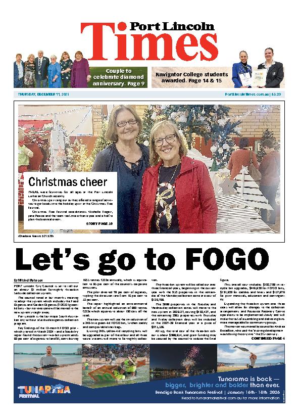 Port Lincoln Times – 11th December 2025 Subscribe or Login to see the rest of the content. Username Password * Remember Me Forgot Password News Squaws overcome resistance from Shields 19/12/2025 There were three great softball matches played between Squaws and Shields on Saturday, which saw two of the three matches won by Squaws, with... Association heads into holiday break 19/12/2025 Port Lincoln Tennis Association (PLTA) has finished the first half of its season with the team managers doing a great job to fill the... Final marks released for local graduates 19/12/2025 The wait for final marks ended on Monday morning for local year 12 students with the release of their Australian Tertiary Admission Rank (ATAR)...