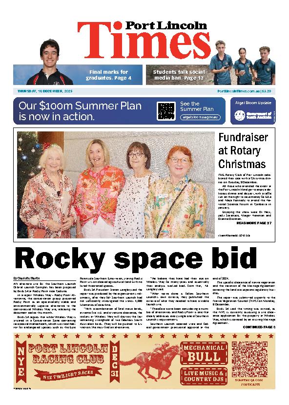 Port Lincoln Times – 18th December 2025 Subscribe or Login to see the rest of the content. Username Password * Remember Me Forgot Password News Squaws overcome resistance from Shields 19/12/2025 There were three great softball matches played between Squaws and Shields on Saturday, which saw two of the three matches won by Squaws, with... Association heads into holiday break 19/12/2025 Port Lincoln Tennis Association (PLTA) has finished the first half of its season with the team managers doing a great job to fill the... Final marks released for local graduates 19/12/2025 The wait for final marks ended on Monday morning for local year 12 students with the release of their Australian Tertiary Admission Rank (ATAR)...