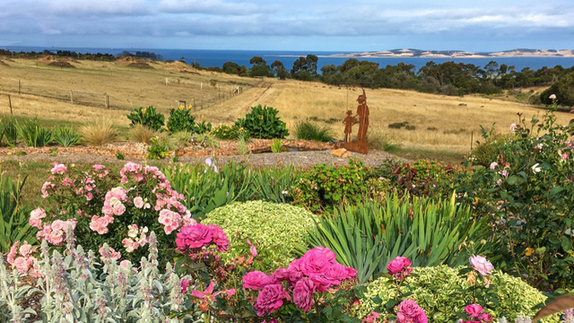 A vacant block just 10 years ago, the property has transformed into a captivating garden that frames breathtaking views across rolling farmland to Boston Bay and Boston Island.