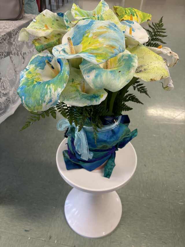 Joy Smith once again had painted her lilies in blue and yellow – the Probus colours – while Marilyn Povey arranged a vase of beautiful flowers on each table.
