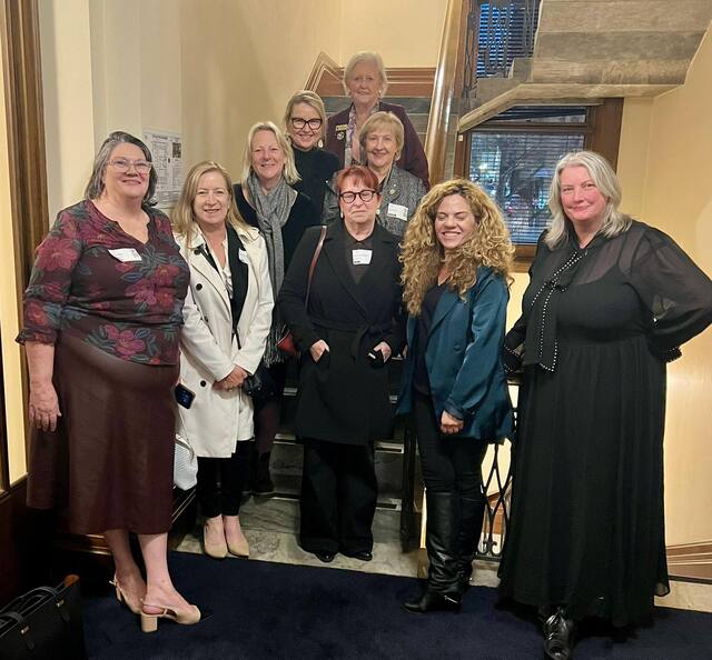 Australian Local Government Women's Association committee members mayor Jill Whitaker, Cr Jayne Hoffmann ALGWA metro vice president Cr Davina Quirke alongside ALGWA members mayor Anne Monceaux and mayor Heather Holmes-Ross (LGA president) and mayor Moira Jenkins attending a legislative council meeting, with Connie Bonaros MLC and Tammy Franks MLC. (Supplied)