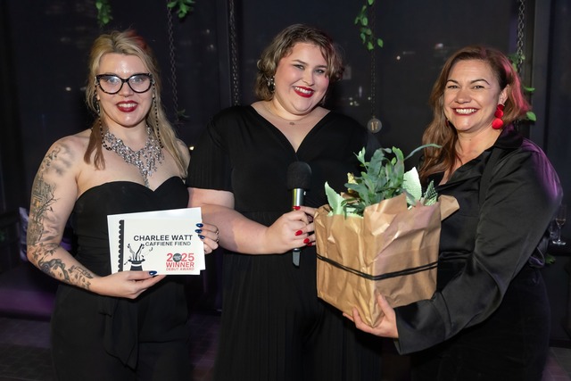 Charlee Watt, centre, receives her Adelaide Cabaret Fringe Festival Debut Award from cabaret burlesque performer Letitia Stitch and CabFringe director Simone Di Sisto. (Facebook, Adelaide Cabaret Fringe Festival)