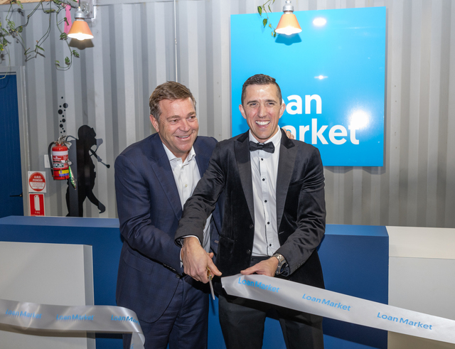 Loan Market Group executive chairman Sam White and Loan Market Link senior finance broker Steven Toome cut the ribbon. (Mitchell Paterson: 493162_09)