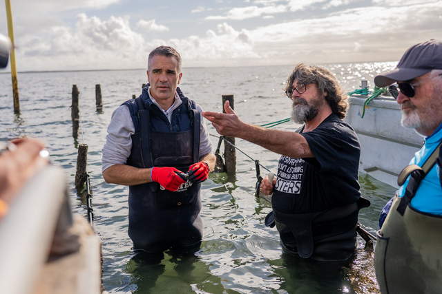Premier Peter Malinauskas, pictured with a Yorke Peninsula oyster grower in July, said the algal bloom was presenting a real challenge for fishers and businesses in many parts of the state. (Supplied)