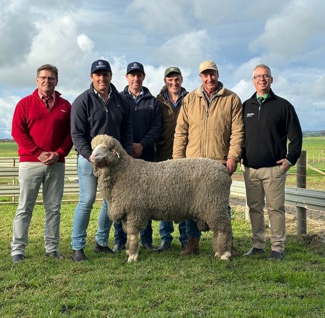 Tony Wetherall from Elders Stud Stock, Xavier Watson, Aaron Watson, Josh Cousins, Paul Cousins and Gordon Wood from Nutrien Stud Stock with the top-priced ram. (Supplied)