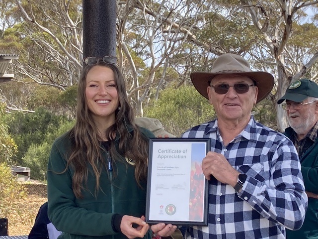 Friends of Parks and Nature vice president Hayley Hogan presents Gerry Taylor of Friends of Southern Eyre Peninsula Parks with a certificate of appreciation to mark the group’s 30 years of volunteering in Lincoln National Park. (Supplied)