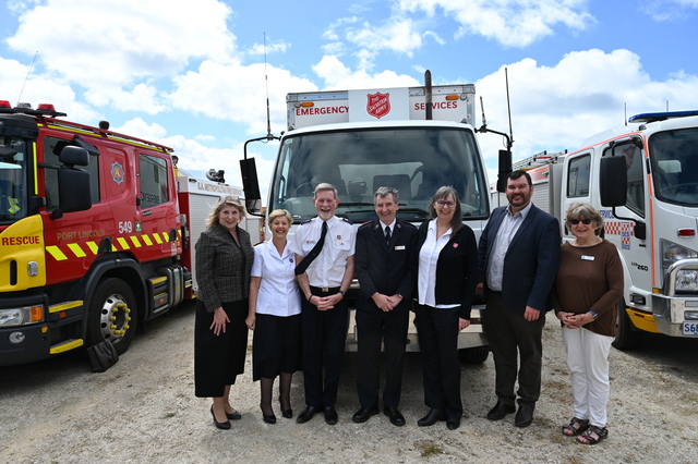 Officially welcoming the Salvation Army Emergency Services catering van were Mayor Diana Mislov, Suzanne Smith, Neal Smith, Major Paul Hateley, Major Wendy Hateley, Flinders MP Sam Telfer and deputy mayor Robyn Rowsell. (Charlotte Martin: 506869_08)