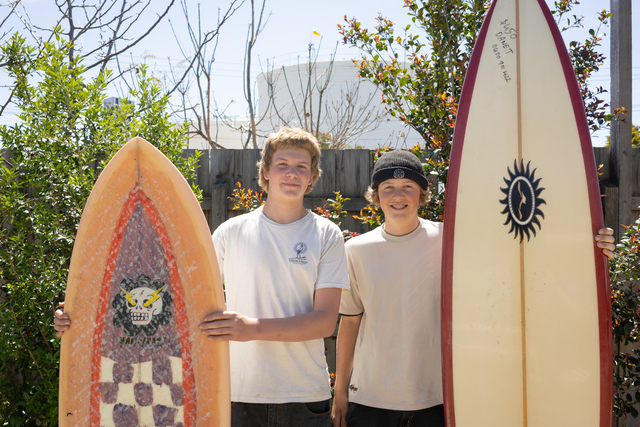 Bodie Barker and Lincoln Anderson pictured with two of the surfboards that were available to purchase in the buy, swap, sell zone at the Stoke Festival Makers Market. (Mitchell Paterson: 508507_03)