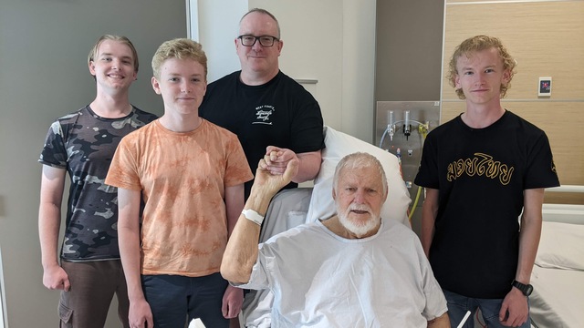 Bill Richter at the Royal Adelaide Hospital earlier this year with wife Denise's son Duane Manuel, and his sons Owen, Sean and Finn. Mr Richter is currently awaiting his level three Home Care Package. (Supplied)