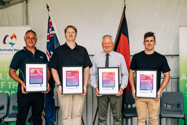 2025 Australia Day Award recipients: Community Event of the Year - Port Lincoln Show - president Semi Skoljarev, Young Citizen of the Year Ryan Walker, Citizen of the Year Peter Hughes and Award for Active Citizenship recipient Anthony Piantedosi. (Robert Lang Photography)