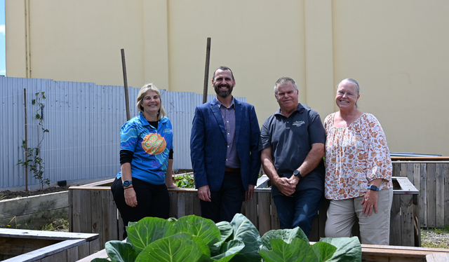 The community garden is thriving, and more volunteers are needed to tend it. West Coast Youth and Community Support coordinator Tracey Miller is pictured with chief executive officer Shaun Rieck and volunteers Jack Stockham and Kerry Graetz. (Charlotte Martin: 510143_01)