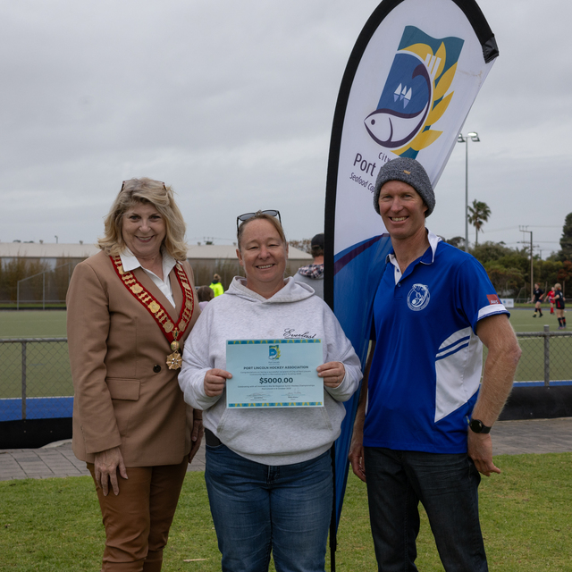 Port Lincoln Hockey Association received a $5000 grant to support the hosting of the 2025 SA Regional Junior Hockey Championships. Pictured is Port Lincoln Mayor Diana Mislov, competition coordinator Yolande Markey and Port Lincoln Hockey Association president Simon Fuss. (Mitchell Paterson: 510497)