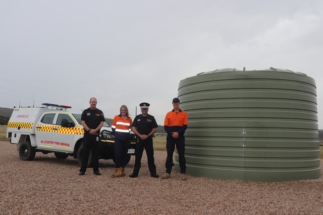 Country Fire Service Eyre Peninsula and West Coast regional commander Stephen Boucher, Acciona Energia senior operations lead Meaghan Cooper, CFS chief officer Brett Loughlin and Cathedral Rocks Wind Farm site manager Craig Nielsen at the new dip tank. (Liam Wormald: 515350_01)