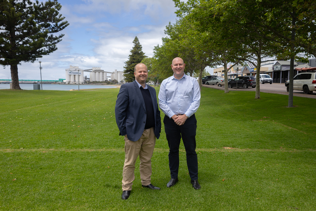 Port Lincoln City Council chief executive officer Eric Brown and SA Water general manager of customer, community and engagement David Coombe announced the partnership. (Mitchell Paterson: 515519_01)