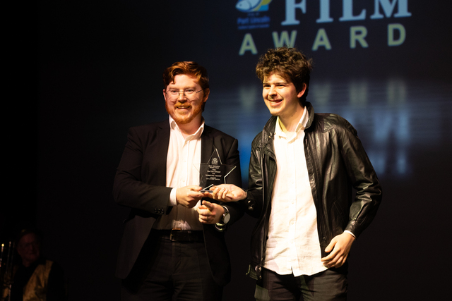 Cr Dylan Cowley presents the City of Port Lincoln Short Film FAME Award to Aaron Cowley, who accepted it on behalf of One Time I Dreamt for 'Annoying Friend'. (Mitchell Paterson: 516978_13)