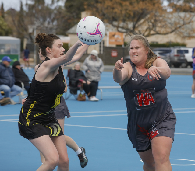 Tasman Imperial wing attack Jordan Sladdin passes the ball while Boston wing defence Tess Watson defends. (Jack Davies: 500386_03)