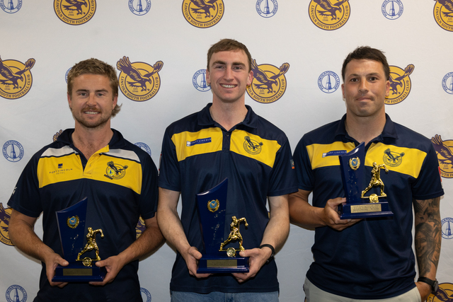 Equal third A grade best and fairest Aiden Baker, best and fairest winner Zane Montgomerie, and equal third best and fairest Brodie Falciani. Absent: Runner-up best and fairest Ben Jarvis. (Supplied)