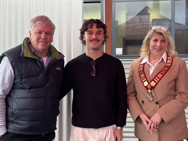 Bryce Hammond was presented with a certificate on Monday that recognised his achievements by SA Regional Junior Hockey Championships founder Grant Hanlon and Port Lincoln mayor Diana Mislov. (Supplied)
