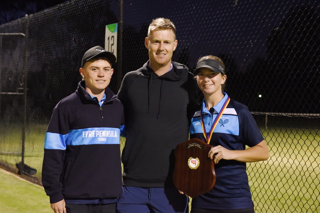 Eyre Peninsula team captains Archie Fitzgerald and Ruby Cabot receiving the winning Luke Saville shield from Luke. (Karen Jericho from Loveday Studio)