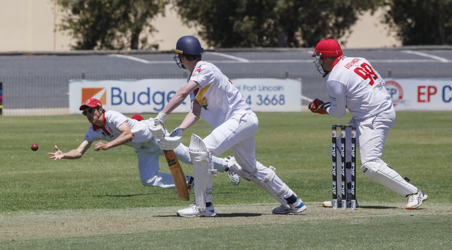 Southern Eyre South batsman Isaac Pertzel plays a forward defensive shot to a ball from Tasman spinner Marlie Fauser, which catches the bat’s edge and carries to Bodhi Fauser in the slips cordon for a spectacular diving catch. (Jack Davies: 525583_27)